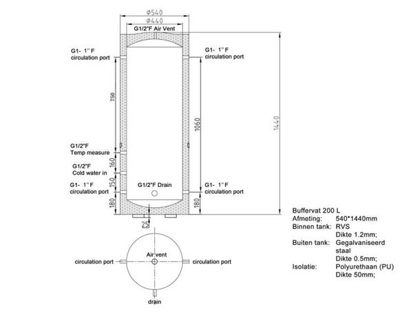 Onze buffervaten zijn vervaardigd van A-Kwaliteit materialen RVS tevens uitwendig voorzien van een dampdichte isolatie polyurethaan.