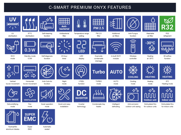 AUX C-Smart Premium Onyx AIRCO SYSTEMEN ZIJN UITERMATE GESCHIKT OM ZOWEL OVERDAG ALS 'S NACHTS UW KLIMAAT OP TEMPERATUUR TE HOUDEN IN ALLE SEIZOENEN TIJDENS KOELEN & VERWARMEN.